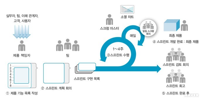 그래서 애자일 개발 프로세스로 불리는 개발 방법론 중 하나가 바로 스크럼이다.